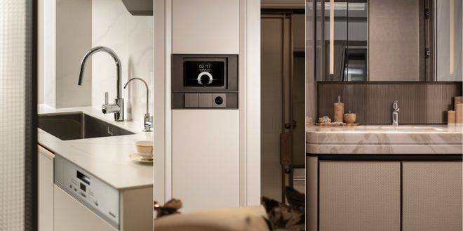 卫浴空间配备唯宝智能卫浴与高仪花洒系统,带来星级酒店般的舒适体验;厨房区域则搭载美诺4件套(燃气灶具、吸油烟机、烤箱、洗碗机)、博世冰箱等.同时,户型还引入华为全屋智能系统,实现家居生活的便捷操控;霍尼韦尔新风系统、日立/东芝空调地暖三大件也全部配齐,全方位保障居住的健康与舒适.